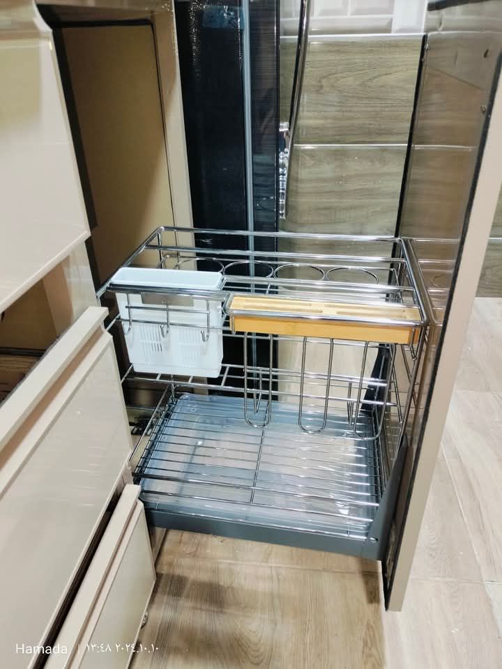 مخصص لحمل زجاجات الزيت، والخل، والصلصات بشكل منظم ميكانيزم ترولي الزيت بمجرى سفلية هو نظام تخزين ذكيم وآمن. يعتمد على مجرى سفلية تتحرك بسلاسة، مما يسمح بسحب الترولي للخارج بالكامل للوصول السهل إلى المحتويات، مع الحفاظ على استقرار الحمولة أثناء الاستخدام. يتميز التصميم بالقوة والمتانة لتحمّل وزن الزجاجات، مع خامات مقاومة للزيوت والرطوبة، ويُركب غالبًا داخل وحدة بجانب البوتاجاز أو الحوض. يتميز بهيكل معدني مطلي كروم أو ستانلس مقاوم للزيوت والصدأ. مثالي لتخزين الزيوت والعبوات الطويلة.