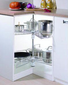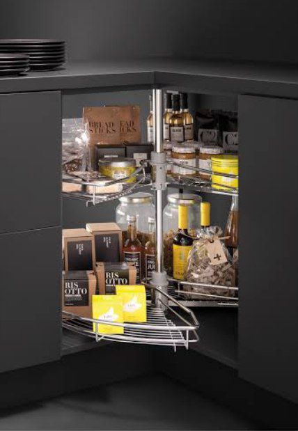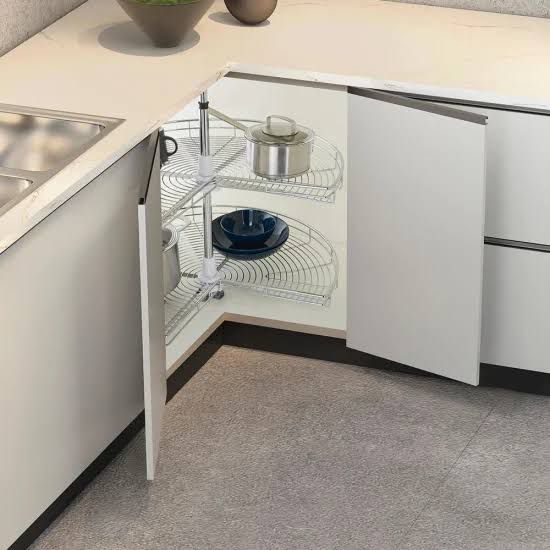 سلة 3/4 دوارة هي واحدة من الحلول الذكية لتنظيم وتخزين أدوات المطبخ داخل وحدات الزوايا